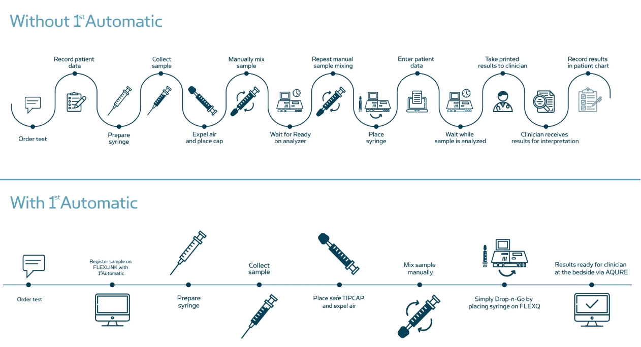 Combine your ABL800 FLEX and safePICO syringes with AQURE's FLEXLINK system to utilise 1st Automatic. The connected solution registers patient, operator and sample IDs at the bedside, while FLEXLINK links these data together. An example of how it could expedite your workflow is shown below.
